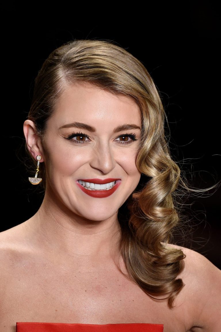 الشفاه يفضل أن تظل متوازنة، باستخدام درجات النيود الدافئ، الوردي الهادئ، أو لمسة خوخية لامعة تضيف نعومة وأناقة. يكمل المكياج بلاشر بدرجات مشمشية أو وردية خفيفة لإضفاء حيوية على الملامح دون أن يطغى على بريق الفستان.