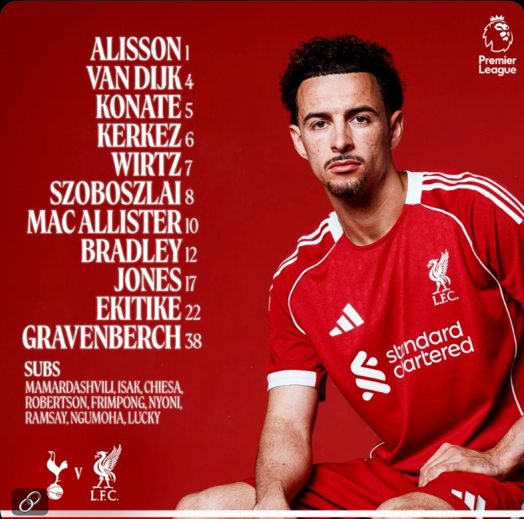 يلعب ليفربول بتشكيل يضم أليسون بيكر في حراسة المرمى. يشارك في الدفاع كونور برادلي، وفان دايك، وكوناتي، وميلوس كيركيز.