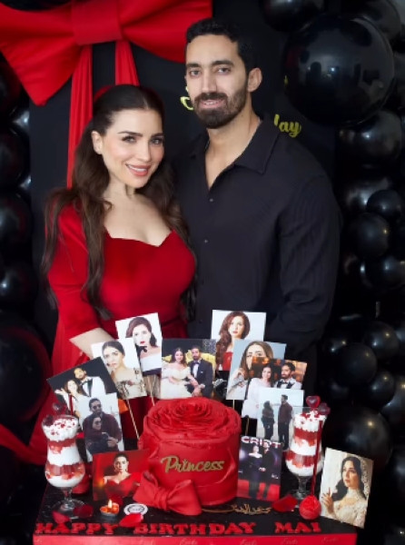 لم تقتصر الاحتفالات على تبادل الكلمات، بل تضمنت لقطات مليئة بالحب والحميمية بين مي عز الدين وزوجها أحمد تيمور.