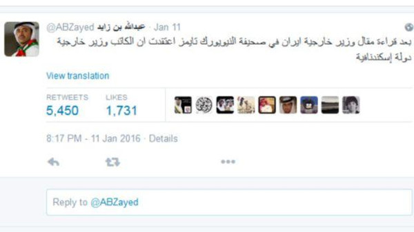 وأثارت تغريدة الشيخ عبدالله بن زايد حفيظة الموالين للحكومة الإيرانية وأشعلت نقاشا محتدما في مواقع التواصل الاجتماعي للناطقين بالفارسية، فانقسم المستخدمون بين مؤيد ومعارض للتغريدة، إلا أن الأغلبية أيدت بشكل مباشر وغير مباشر موقف الوزير الإماراتي، حيث اعتبرت تهكمه على نظيره الإيراني من خلال وصفه “كأنه وزير خارجية دولة اسكندنافية” جاء في محله على ضوء المقال الذي كتبه لفائدة “نيويورك تايمز”، مؤكدين أن ما قامت به الميليشيات المدنية الموالية للسلطة في الهجوم على سفارة المملكة العربية السعودية غير قابل للتبرير، معتبرين رد السعودية جاء نتيجة لأخطاء الجانب الإيراني.