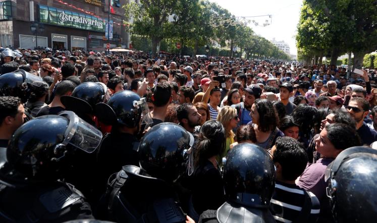 وردّد المتظاهرون هتافات مثل “شغل، حرية، كرامة، وطنية” وهو أحد الشعارات الرئيسية لـ الثورة التونسية التي أطاحت يوم 14 يناير/كانون الثاني 2011 بنظام زين العابدين بن علي.